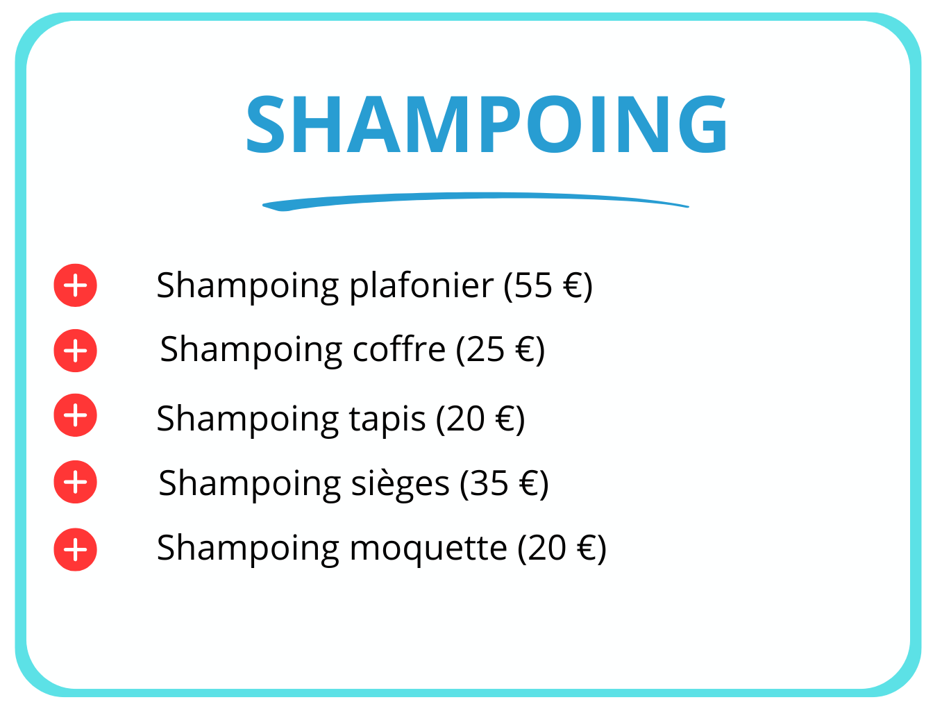 En plus de nos prestations principales, nous proposons une gamme de suppléments pour redonner à votre véhicule tout son éclat. Shampoings adaptés, traitements spécifiques pour l’intérieur , finitions protectrices et soins détaillés : chaque option est pensée pour répondre aux besoins précis de votre voiture.
